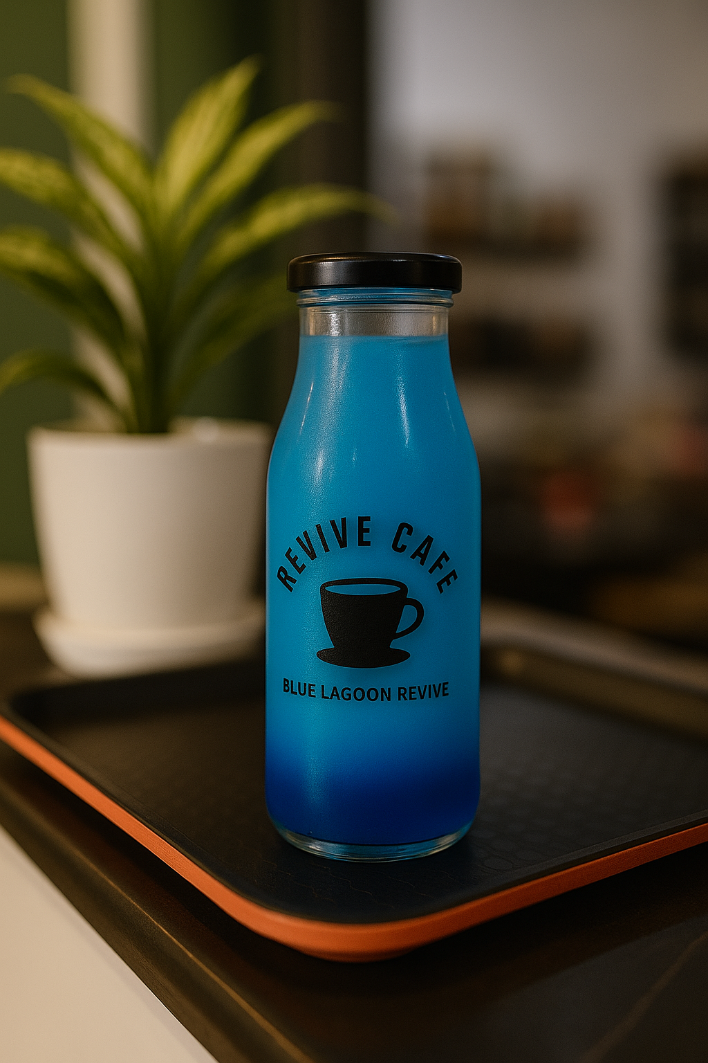 At Revive Cafe, we bring you the ultimate refreshing experience with our signature Blue Lagoon Revive – a drink that perfectly blends taste, energy, and style. Crafted with the vibrant flavor of blue curaçao, a splash of zesty lemon, and the sparkle of chilled soda, this beverage is designed to uplift your mood instantly. Its striking blue color is not just visually appealing but also makes it a favorite for those who love both taste and aesthetics.